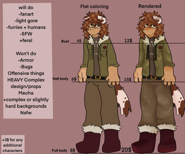 For money, flat colored bust is 4$ half body 6$ full body 8$ a rendered bust is 12$ 15$ for half body 20$ for a full body. +3$ for any additional characters